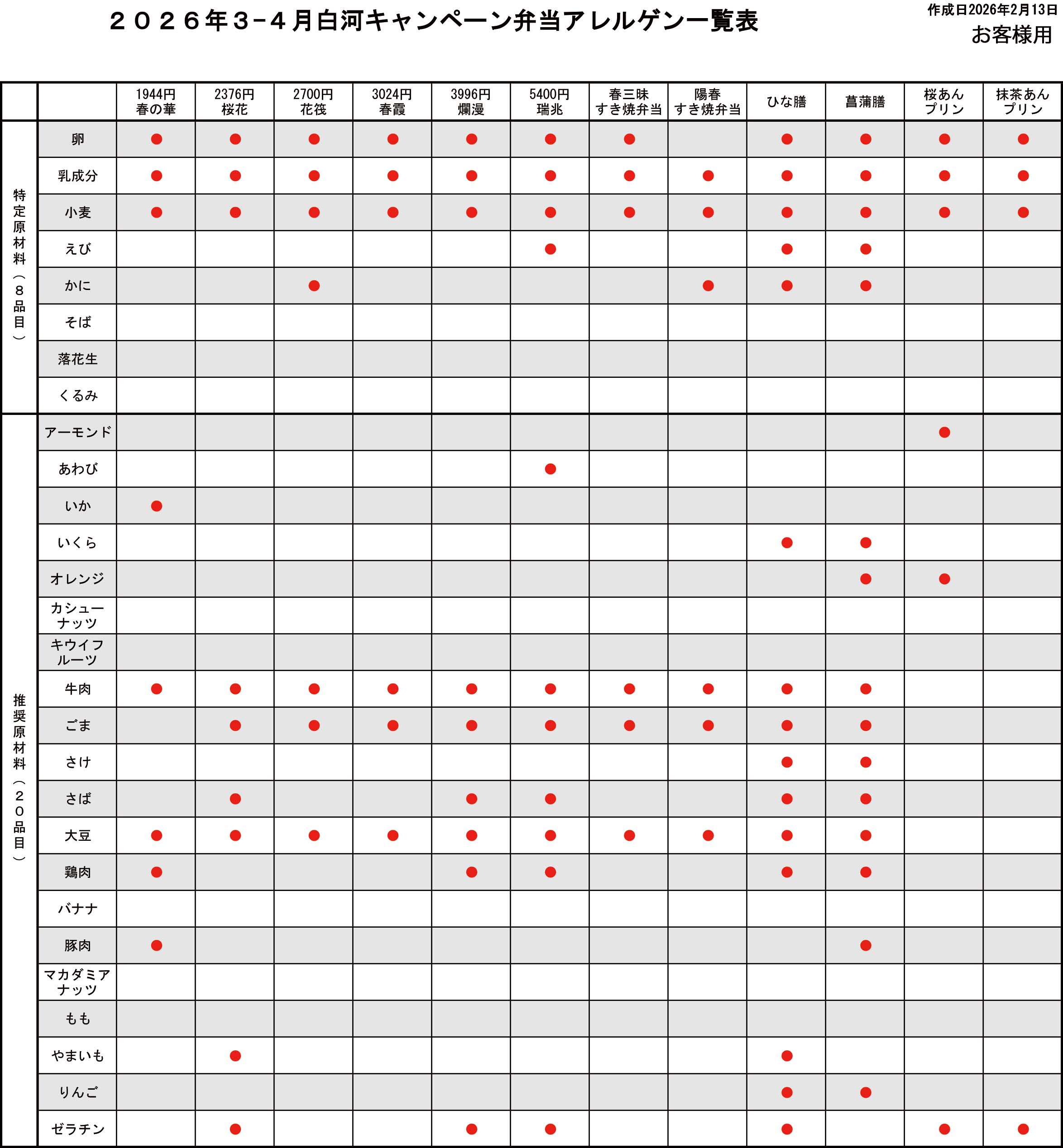 アレルギー物質については、食品表示法にて表示義務のある8品目と表示が推奨されている20品目のうち、アレルギー物質を含むものについて表示(●)しております。
